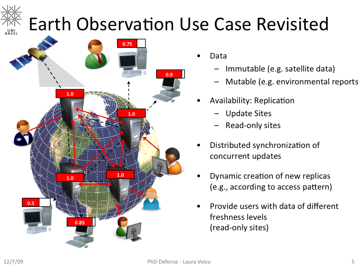 My PhD dissertation “Dynamic Data Replication in the Grid with Freshness and Correctness Guarantees” (download here) explores architectural issues and performance aspects of Data Grid infrastructures. The objective is to develop a scalable infrastructure that is capable to dynamically manage replicated data in the Grid while at the same time providing freshness and correctness guarantees. We propose a decentralized middleware which can be deployed on top of any Grid (or any distributed, heterogeneous infrastructure). The difficulty is to ensure that such an infrastructure can offer scalability, performance and correctness.